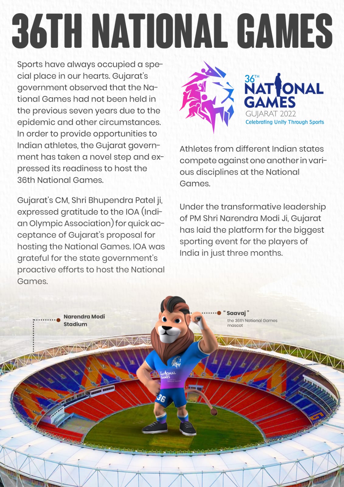 Sports have always occupied a special place in our hearts. Gujarat's government observed that the National Games had not been held in the previous seven years due to the epidemic and other circumstances. In order to provide opportunities to Indian athletes, the Gujarat government has taken a novel step and expressed its readiness to host the 36th National Games. Gujarat's CM, Shri Bhupendra Patel ji, expressed gratitude to the IOA (Indian Olympic Association) for quick acceptance of Gujarat’s proposal for hosting the National Games. IOA was grateful for the state government's proactive efforts to host the National Games.